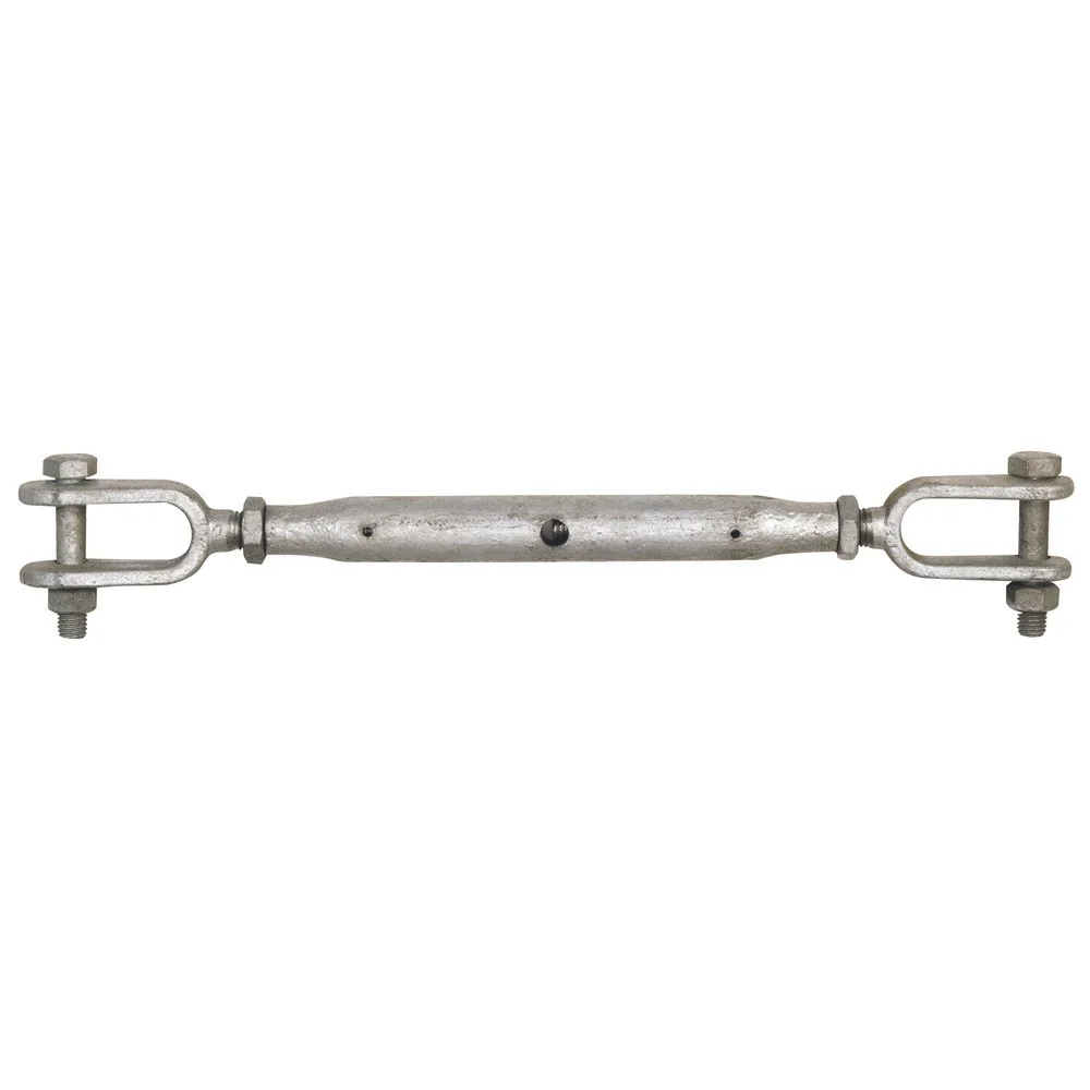 - Jaw and jaw ends — clevis-style forks on both ends accept pins for secure attachment to eye bolts, chain links, and structural fittings.