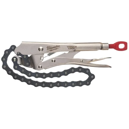The Milwaukee 48-22-3542 Torque Lock™ Locking Chain Wrench holds and locks around objects of any shape up to 79mm in diameter. The chain design wraps securely around pipes, irregular fittings, and round stock, then locks with adjustable clamping force for hands-free holding or controlled turning.