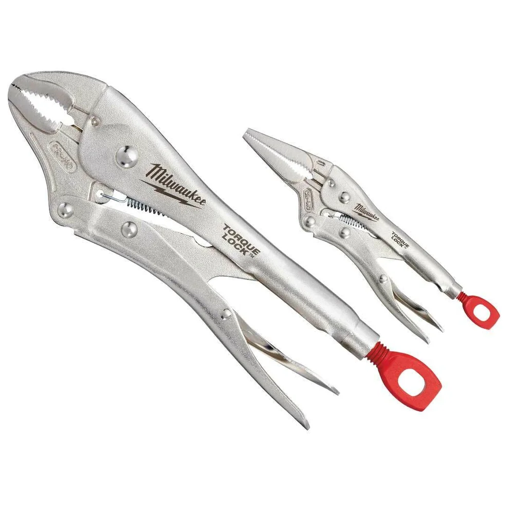 The Milwaukee 48-22-3602 Torque Lock™ 2 Piece Locking Pliers Set pairs the 250mm (10″) curved jaw locking pliers with the 150mm (6″) long nose locking pliers. Together they cover the two most common locking plier tasks: heavy gripping and precision reach in tight spaces.