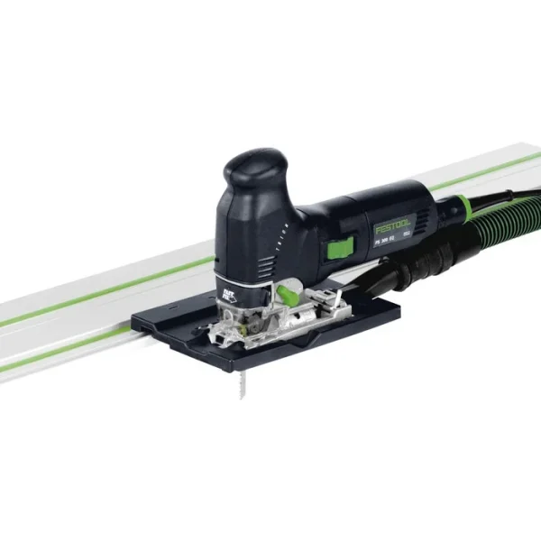 Use the 490031 when you need straight jigsaw cuts along a guide rail — particularly useful for curved materials where a plunge saw would be overkill, or for cuts in thin panels where the jigsaw blade type matters more than cut speed. For router guide rail work, use the 492601 FS-OF 1400 adaptor instead.