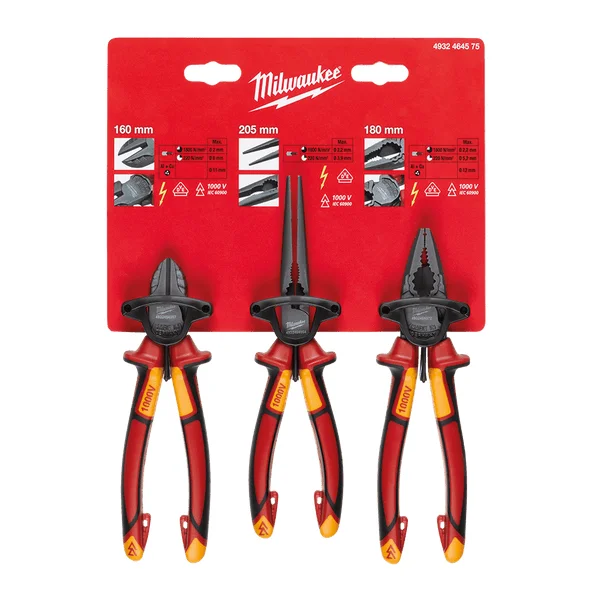 The Milwaukee VDE plier set provides the three essential plier types every electrician needs for live electrical work. The combination pliers handle gripping and cutting, the long nose pliers reach into junction boxes and tight spaces, and the diagonal cutters deliver clean cable cuts. All three are VDE certified for peace of mind on live circuits.