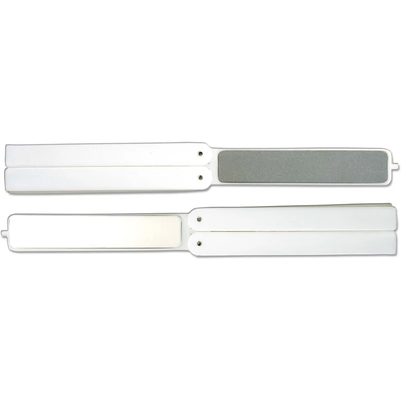 The Eze-Lap 530 Eze-Fold is a double-sided folding sharpener with diamond on one side and ceramic on the other. The compact design folds closed to protect the sharpening surfaces and opens to form a comfortable handle. Ideal for kitchen drawers, glove boxes, and backpacks.