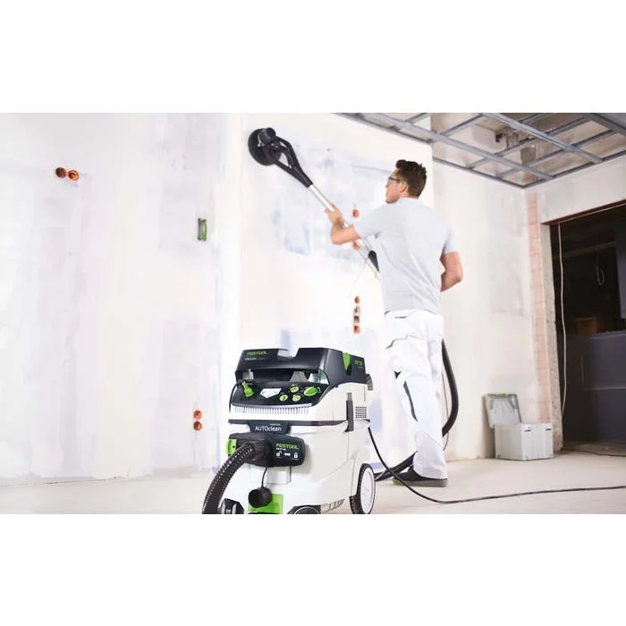 The 571937 PLANEX Easy is purpose-built for plasterers, painters, and renovation contractors who sand ceilings and walls. Use it for finishing plasterboard joints, smoothing filler, removing wallpaper residue, and stripping old coatings. The direct-drive design and 4 kg weight make full-day overhead work feasible where shaft-driven long-reach sanders cause premature fatigue. Always connect to a Festool CT dust extractor — drywall dust without extraction is a serious respiratory hazard.