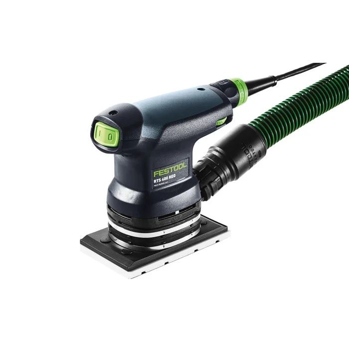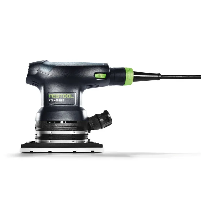The Festool RTS 400 REQ is a compact rectangular orbital sander with an 80x133mm (1/4 sheet) pad. Its straight-line orbital action and flat pad profile make it the precision tool for flush sanding on flat surfaces, edges, and up against abutting details. At 1.2 kg with 250W and MMC electronics, it delivers controlled finishing power in a one-handed package.