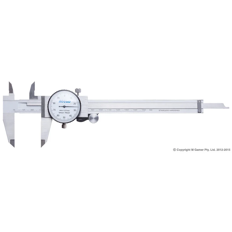 The Accud AC-101-006-11 is a 0–150mm dial caliper reading to 0.02mm with shock-protected movement. Stainless-steel construction, rotating bezel and continuous dial face — the battery-free analog caliper that stays accurate session after session without electronic failure risk.