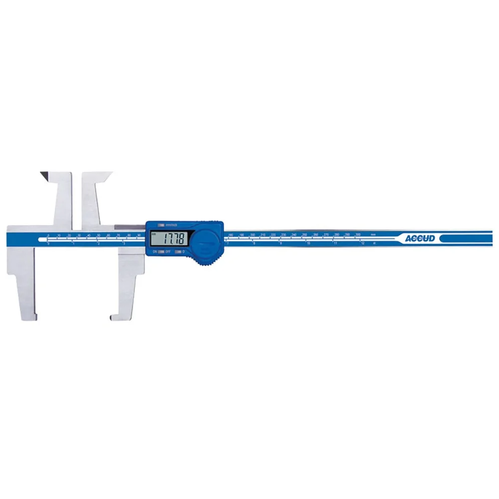 The Accud AC-158-012-11 is a 0–300mm digital caliper purpose-built for drum brake measurement. Extended 61mm jaws reach inside the drum to the braking surface, and the digital display reads inside and outside diameters to 0.01mm — essential for assessing drum wear against manufacturer specs.