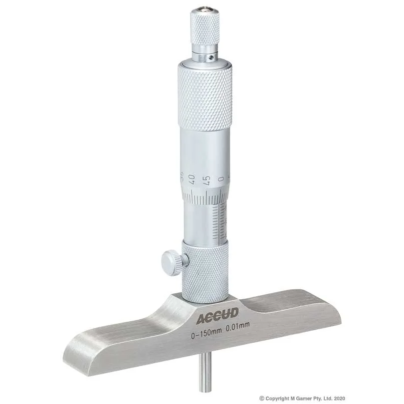 The Accud AC-391-006-01 is a precision depth micrometer covering 0–150mm at ±3µm accuracy. Ground-flat base, interchangeable measuring rods and ratchet stop — built for measuring the depth of bored holes, slots, shoulders and recesses to tight tolerances.