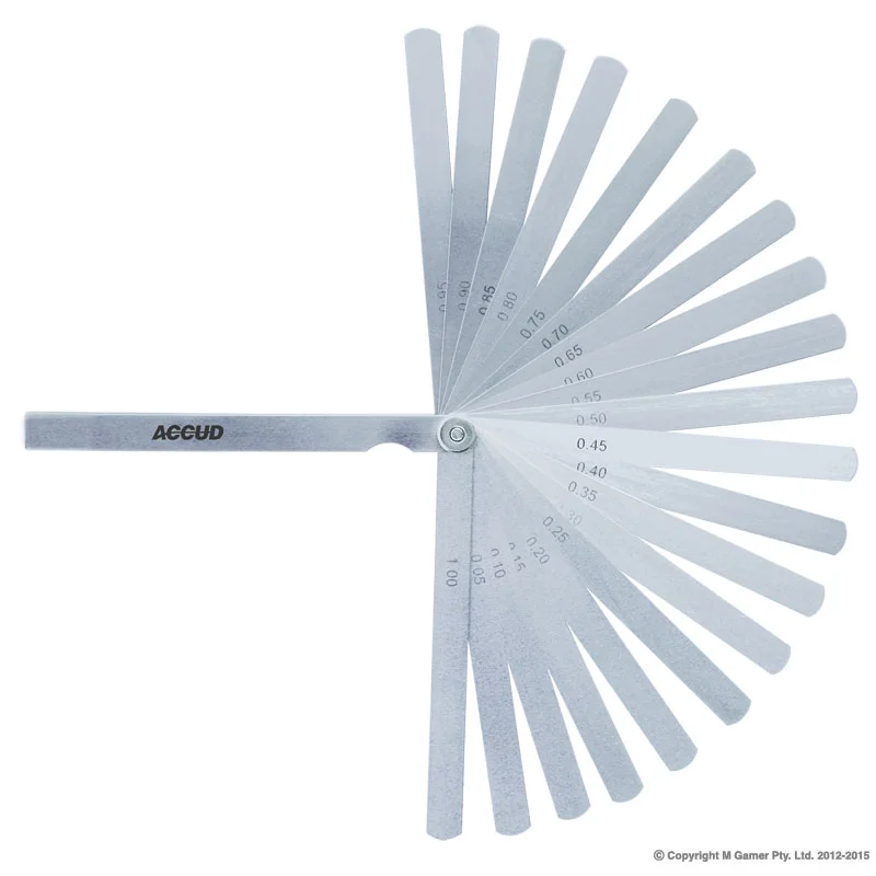 Pro Tip: The right blade slides into the gap with a light drag — not loose, not forced. If it won’t enter, step down one blade and try again; if it slides freely with no drag, step up. Stacking two blades (e.g. 0.10mm + 0.15mm to make 0.25mm) is acceptable when the exact blade isn’t in the set, but one blade is always more reliable than a stack.