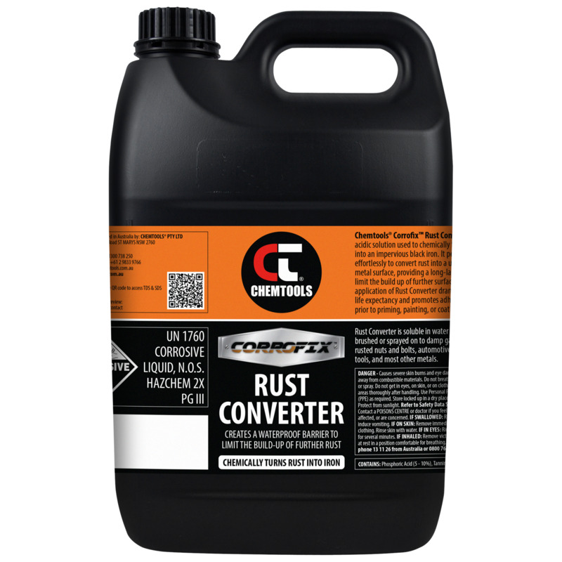 • Chemtools CorrofixTM Rust Converter is a mildly acidic solution used to chemically turn rusty metal into an impervious black iron to limit further corrosion. It effortlessly converts rust into a usable waterproof metal surface, providing a long-lasting barrier.