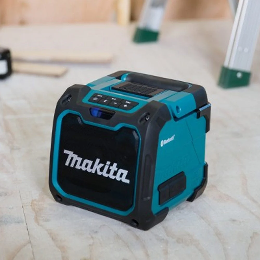 Rugged cordless Bluetooth speaker delivering up to 10 watts through a dedicated 101.6 mm woofer and 36 mm tweeter. IP64 rated for dust-tight and splash-proof jobsite use, it runs on Makita 12V CXT or 18V LXT batteries with a 240V AC adapter fallback, and includes a sealed device cabinet and 2.1A USB charging port.