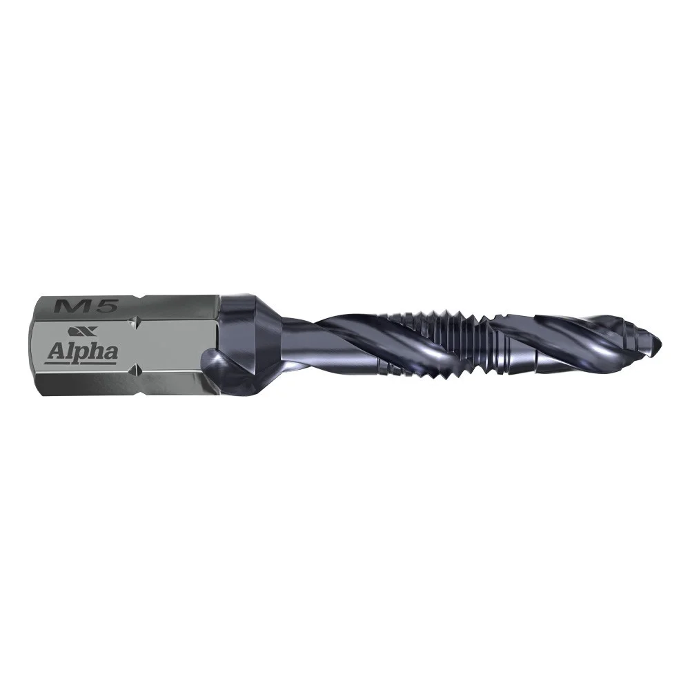Alpha Onsite+ Combination Drill & Tap in M050. Combines drilling, chamfering, tapping, and deburring in one pass. Features patented step tip, AITiN coating, and 1/4″ insert shank. 6x faster than conventional methods.