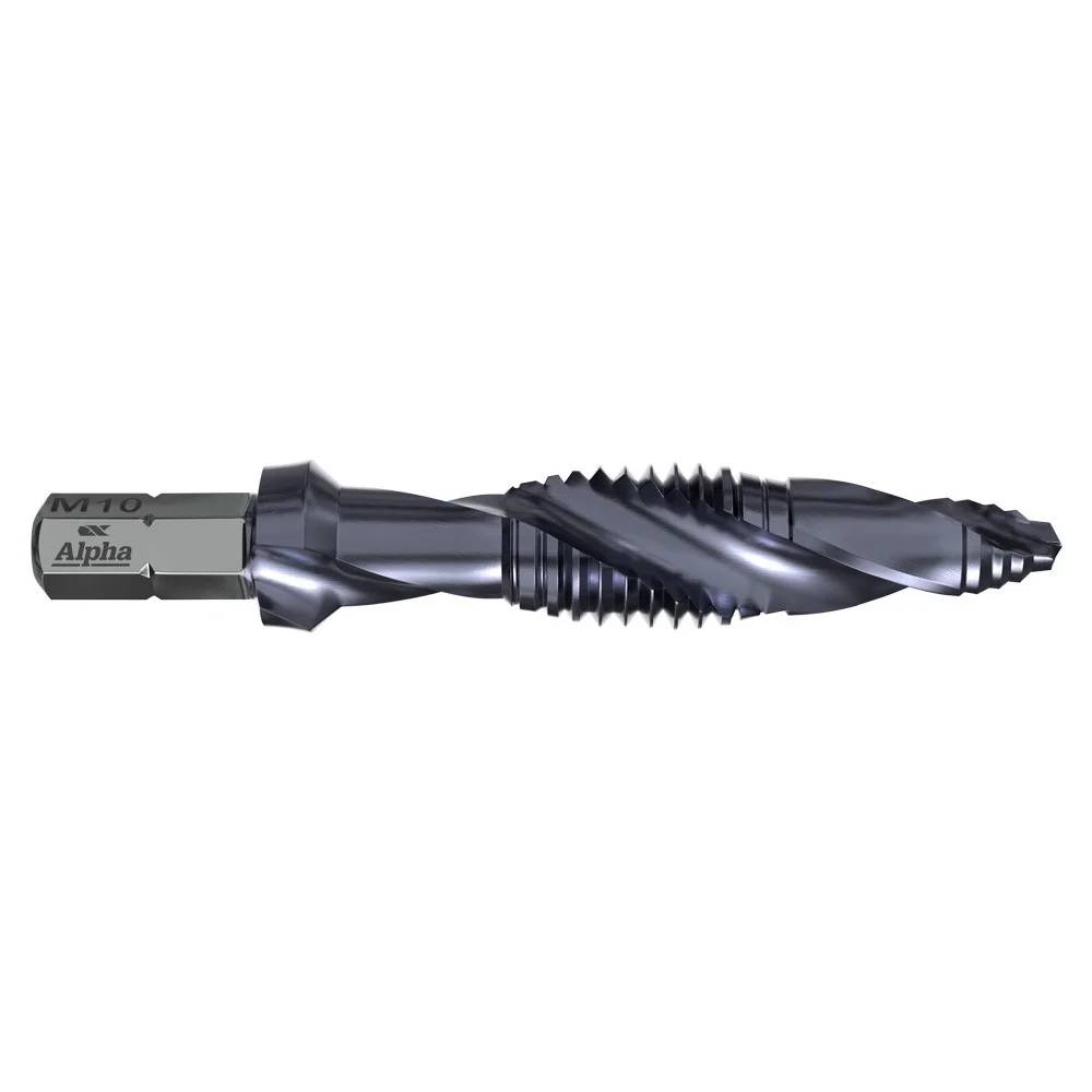 The Alpha Onsite+ Combination Drill & Tap in M100 combines four separate processes — drilling, chamfering, tapping, and deburring — into a single tool. Featuring the patented step tip design and AITiN coating, this bit eliminates pre-drilling and delivers results 6x faster than conventional drill-and-tap workflows.