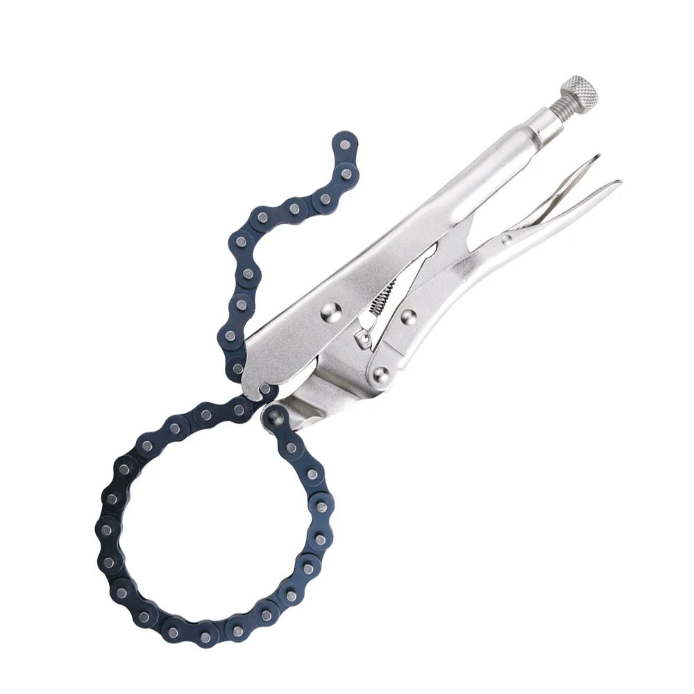 - Chain design — chain jaw that wraps around pipes, rods, and irregular shapes for locking grip on round stock.