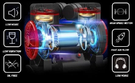 - Oil-free pump design — clean, dry air with zero oil maintenance.