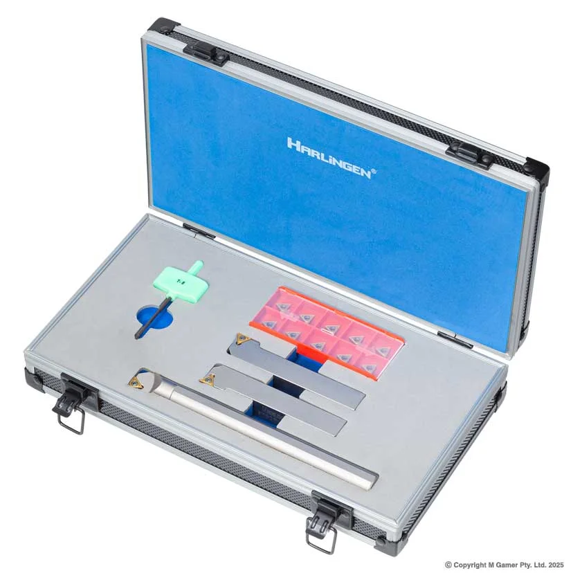 Three 16mm positive-rake holders — RH, LH and a boring bar — supplied with TCMT110204 inserts plus ten spares. Positive rake geometry suits clean finishing cuts and softer materials on mid-size lathes.