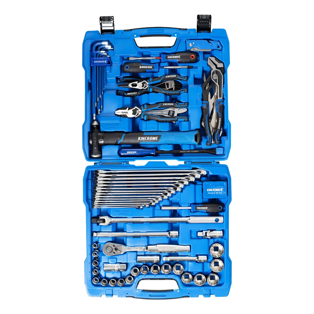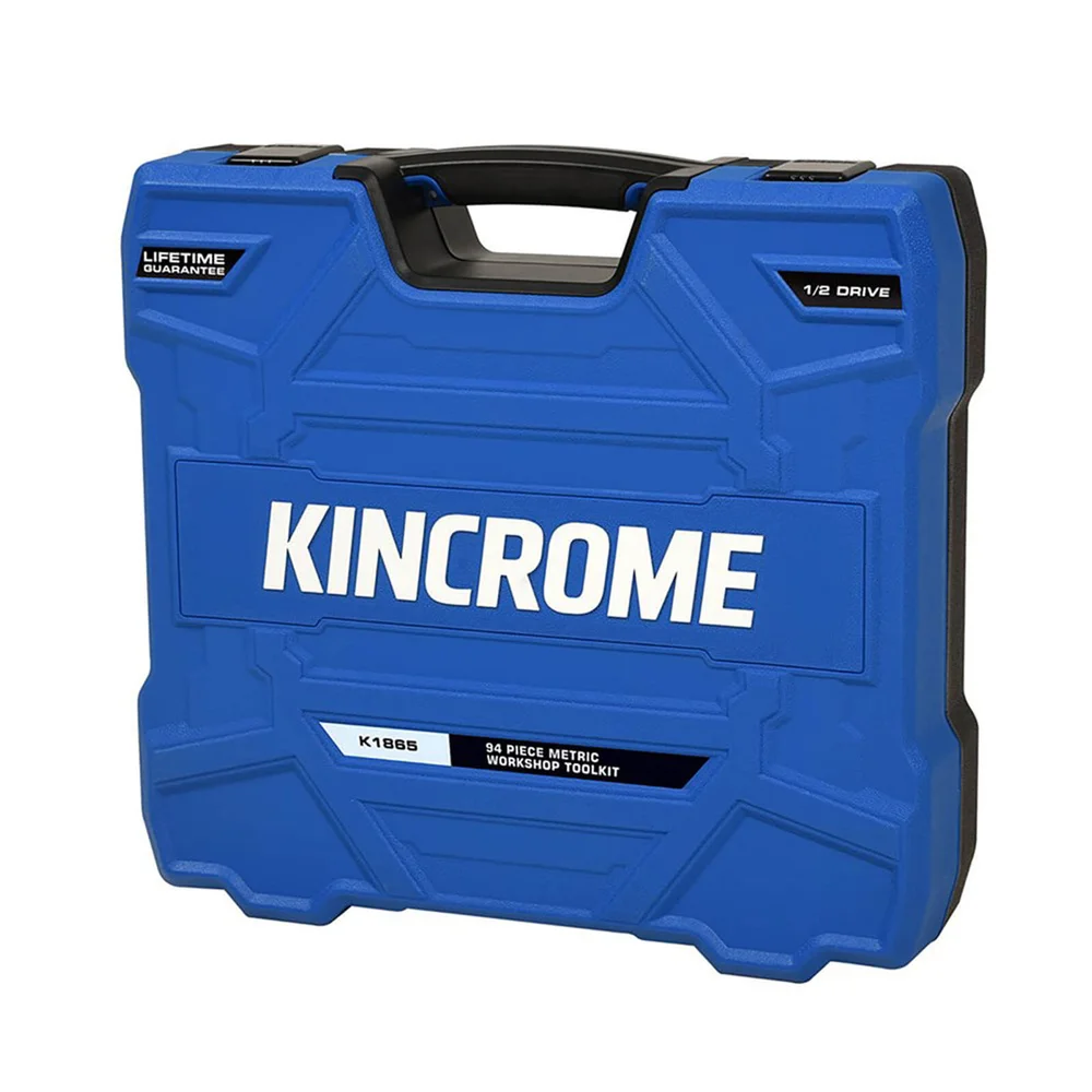 The Portable Tool Kit 94 Piece 1/2" Drive (K1865) is a 94 pc portable Kincrome kit housed in a durable blow-mould carry case (430 x 385 x 110mm, 13 kg). Drive: 1/2". Backed by the Kincrome Lifetime Guarantee on hand tools.