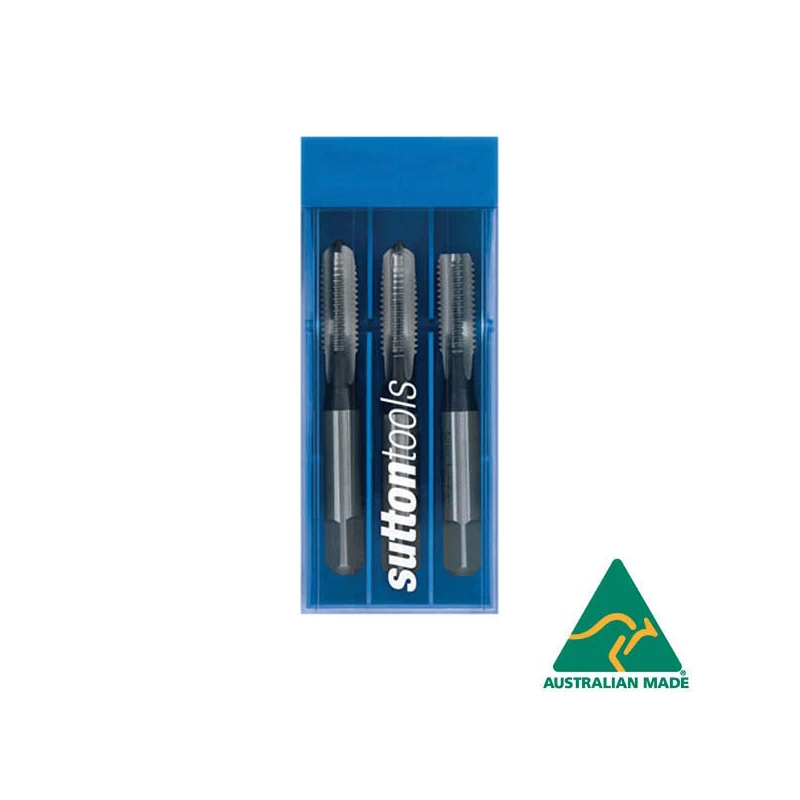 Sutton carbon-steel hand tap for general workshop and hobby threading in mild steel, brass, aluminium and other softer metals. Cost-effective alternative to HSS for occasional use and fastener-thread restoration. This M8x1.25 Set variant covers the Metric Coarse (M) thread standard — Standard ISO Metric coarse-pitch threads — the default for modern engineering, perfect for general workshop maintenance and hobby use in mild steel and softer metals.