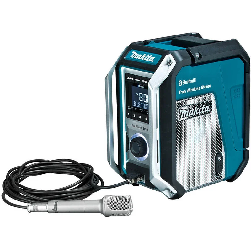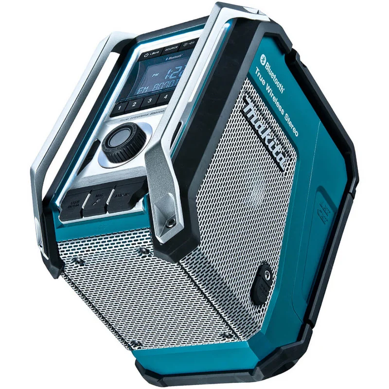 The MR005GZ is Makita’s premium jobsite audio solution. The 25W subwoofer sets it apart from every other cordless jobsite radio — you actually hear bass, not just tinny mids and highs. Group Chain is the standout feature for larger sites: link up to 10 units wirelessly and place them through a building so the crew on every floor hears the same audio without running cables.