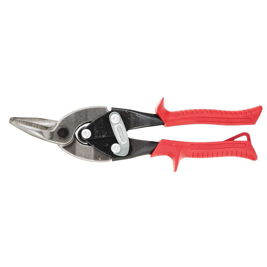 Traditional 10″ aviation-style tin snip with compound leverage and forged alloy steel blades, designed for left-hand curved cuts in sheet metal and ductwork.