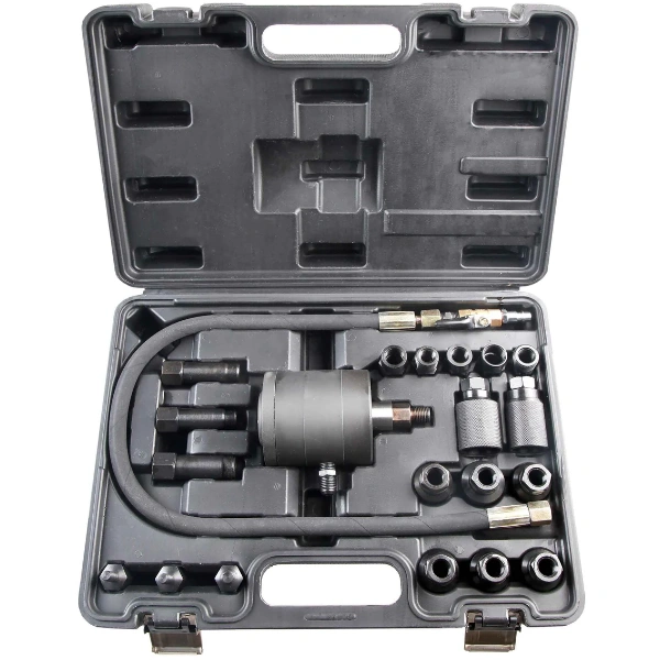 Professional 21-piece kit for hands-free pneumatic removal of stubborn diesel injectors. Uses a pneumatic hammer device to extract injectors without inertia hammers or mechanical extractors — ideal for Mercedes and many other diesel engines.