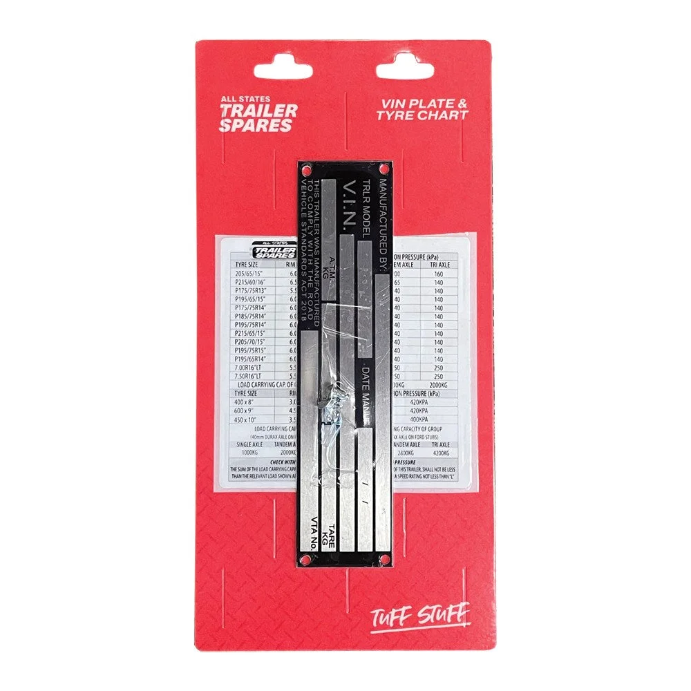 Combined VIN plate and tyre pressure chart for trailer registration compliance. Required on all registered Australian trailers. Durable construction for permanent chassis mounting.