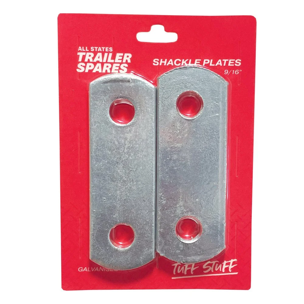 Galvanised steel shackle plates with 1/2″ bolt holes for trailer leaf spring suspension. Sold as a pair. Essential for connecting leaf spring ends to the trailer chassis.