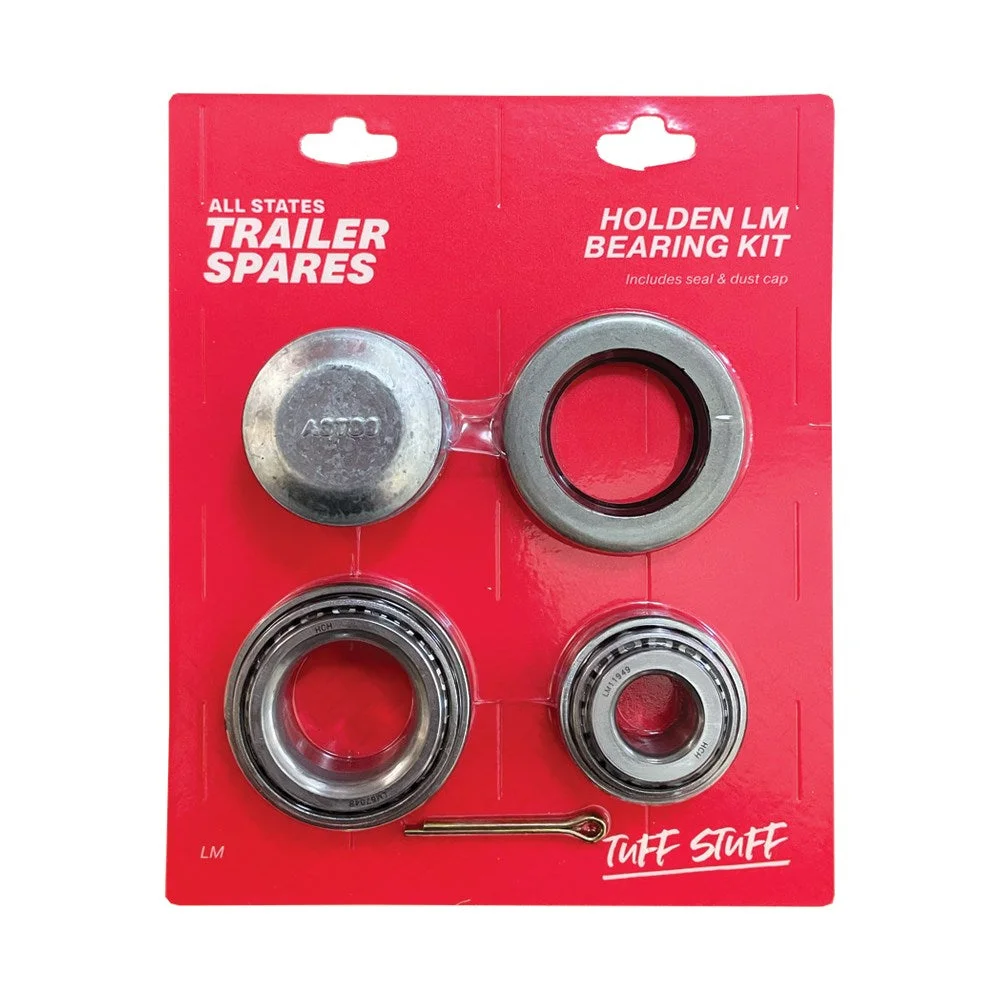 Complete LM (Holden-type) marine trailer bearing kit with upgraded marine-grade seals for boat and jet ski trailers. Includes inner and outer bearings, marine seal, 45mm dust cap and split pin.