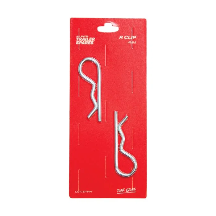 Spring steel R clips (lynch pins) for 4mm diameter pin holes. Sold as a pair, these clips snap through a drilled hole in a pin or shaft to prevent it from sliding out. Common safety retention device on trailer couplings and hitch pins.