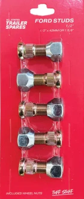 Replacement 1/2″ wheel studs and nuts for Ford pattern trailer hubs. Press-in studs with matching wheel nuts for securing wheels to trailer hubs with Ford 5-stud (5×114.3 PCD) bolt pattern.