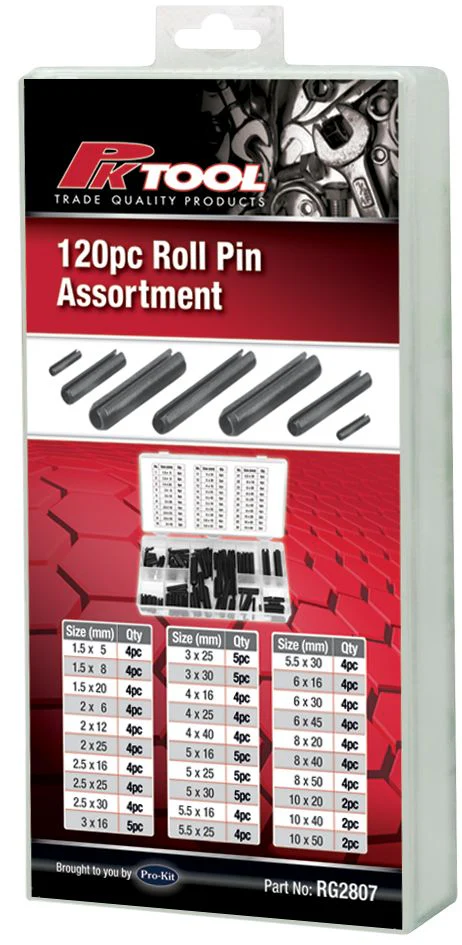 The ProKit RG2807 provides 120 coated metal roll pins from 1.5mm to 10mm diameter across multiple lengths, stored in a labelled plastic case. Roll pins secure shafts, gears, shift forks and linkages in engines, transmissions, differentials and general mechanical assemblies.