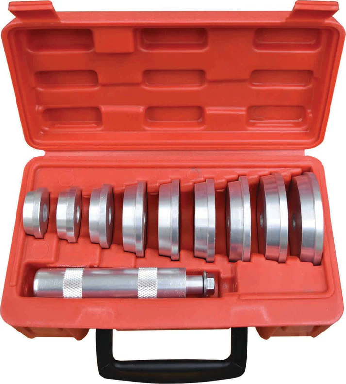 The RG5257 from PK Tool is a 10-piece bush, bearing and seal driver set covering nine sizes from 39.5 mm to 81 mm. Angled drivers provide access to restricted locations, and the set handles both removal and installation across most passenger and light commercial vehicles.