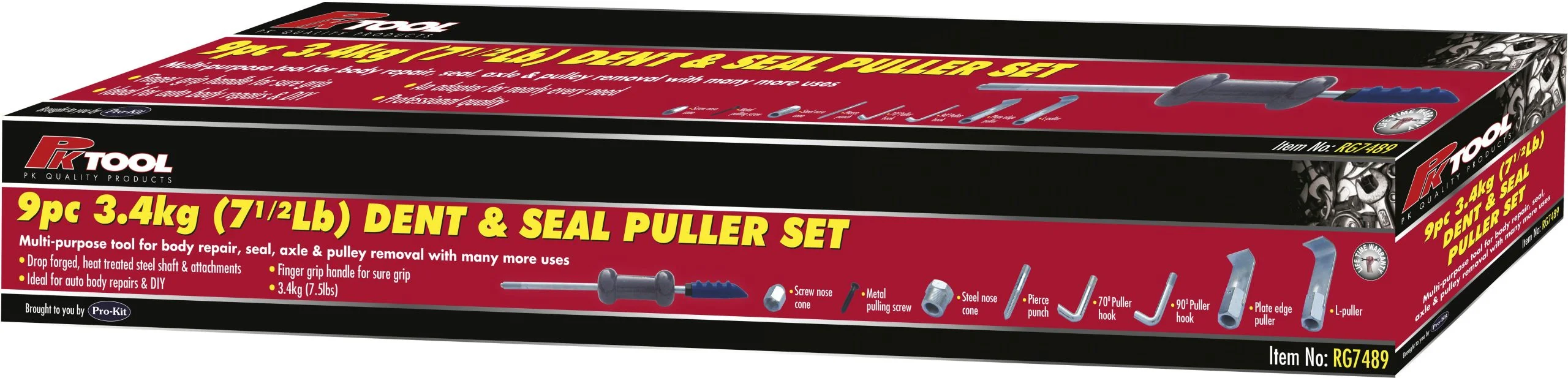 The PKTool RG7489 slide hammer and dent puller set combines a 3.4kg drop-forged hammer with eight interchangeable attachments covering dent pulling, seal removal, piercing and hook-style pulls. A versatile workshop tool for panel work, bearing and seal removal.