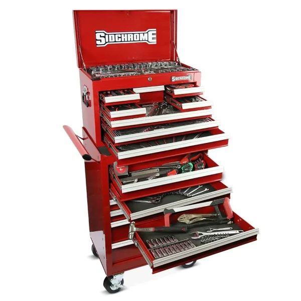 Sidchrome’s 250 piece metric and A/F tool kit is the full apprentice and trade workshop solution — a 7-drawer roller cabinet plus matching top chest, both fitted with EVA foam-lined drawers. Comprehensive three-drive coverage with mechanics’ bit set, deep sockets, and a complete hand tool complement.