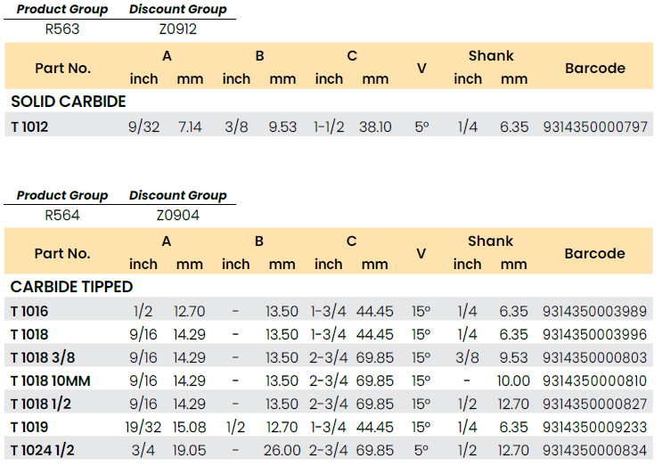| T 1012 ★ | 9/32 | 7.14 | 3/8 | 9.53 | 1-1/2 | 38.10 | 5° | 1/4 | 6.35 | 9314350000797 |