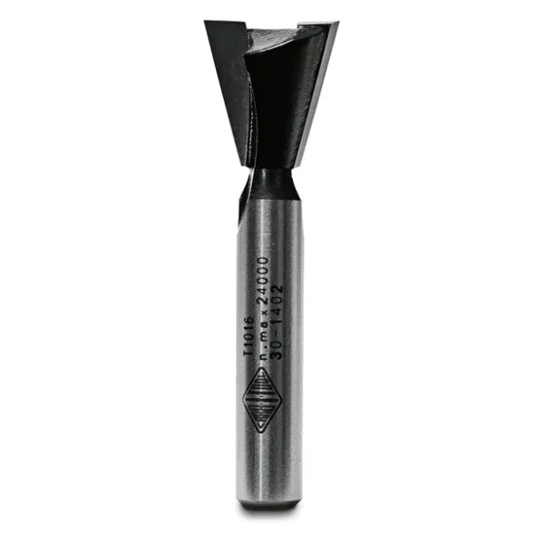 Carbide-tipped dovetail router bit producing an interlocking angled profile for strong, attractive joinery. The undercut geometry is essential for drawer boxes, cabinet carcasses, and any joint requiring mechanical pull-out resistance alongside a glue-line bond.