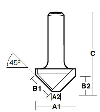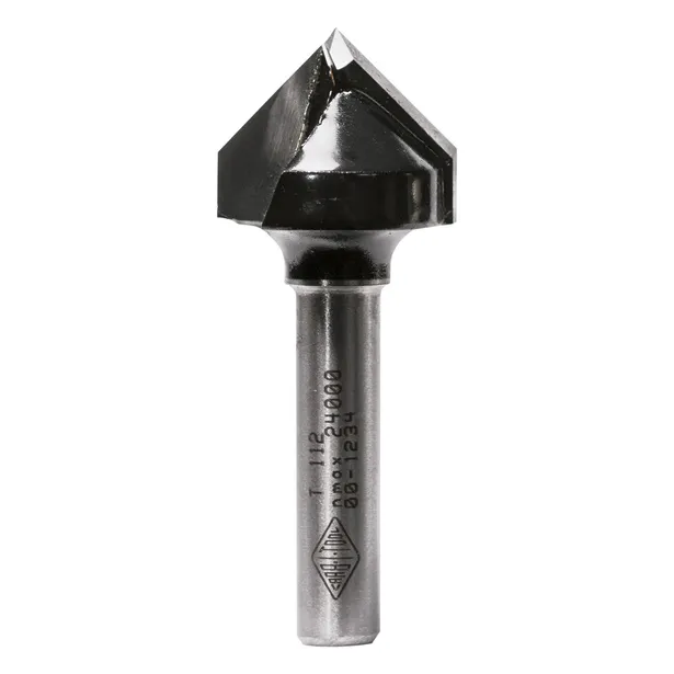 Carbide-tipped 90-degree V-groove router bit for decorative grooves, chamfering, and sign lettering in timber and panel products. The 90-degree included angle is the most versatile V-groove profile — cuts a clean, symmetrical groove with equal 45-degree faces on both sides.