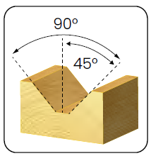 - 90-degree included angle — cuts equal 45-degree faces on both sides of the groove; the most common V-groove profile for decorative panelling, sign lettering, and chamfering.