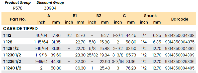 | Part No. | A inch | A mm | B inch | B mm | C inch | C mm | Angle | Shank inch | Shank mm | Barcode |