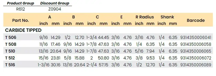 | Part No. | A (Dia.) inch | A mm | B (Cut Length) inch | B mm | C (OAL) inch | C mm | E inch | E mm | R Radius inch | R mm | Shank inch | Shank mm | Barcode |