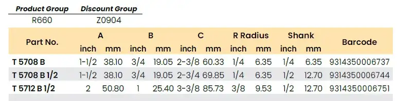 | Part No. | A (Cutting Dia.) inch | A mm | B (Cut Length) inch | B mm | C (Overall Length) inch | C mm | R Radius inch | R mm | Shank inch | Shank mm | Barcode |
