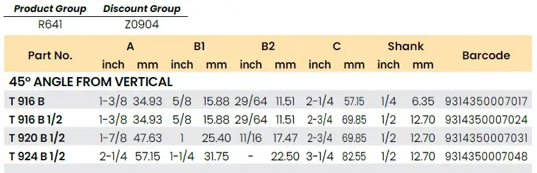 | T920B 1/2 ★ | 45° from vertical | 1-7/8 | 47.63 | 1 | 25.40 | 11/16 | 17.47 | 2-3/4 | 69.85 | 1/2 | 9314350007031 |