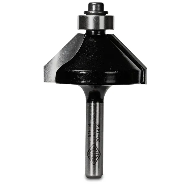 The Carbitool T920B 1/2 is a 2-flute carbide-tipped chamfering bit with ball bearing guide, cutting a 45° (90° included) chamfer. Produces clean angled edges on timber and sheet materials, suitable for decorative chamfering, assembly joints and sign work. 1/2" shank.