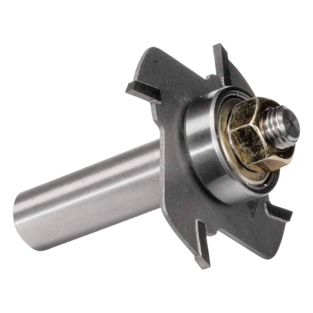 - Integrated ball bearing guide — the top-mounted bearing rides against the workpiece edge, controlling depth of cut and eliminating guide-fence setup on profile work.