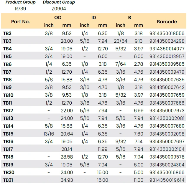 | TB7 | 1/2" | 12.70 | 1/4" | 6.35 | 1/4" | 6.35 | 9314350009479 |