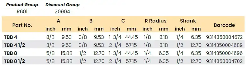 | Part No. | A inch | A mm | B inch | B mm | C inch | C mm | R Radius inch | R mm | Shank inch | Shank mm | Barcode |