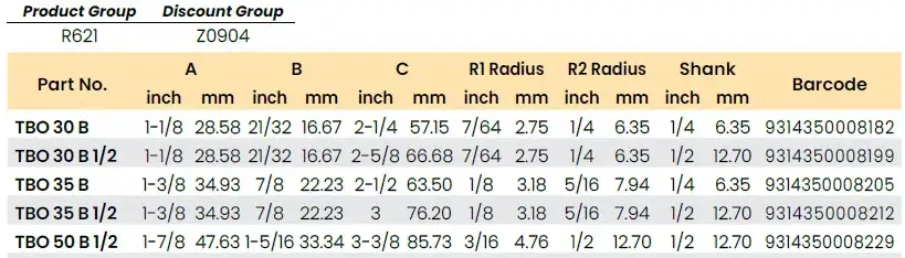 | Part No. | A inch | A mm | B inch | B mm | C inch | C mm | R1 Radius inch | R1 mm | R2 Radius inch | R2 mm | Shank inch | Shank mm | Barcode |