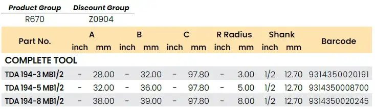 | Part No. | A (Cutting Dia.) inch | A mm | B (Cut Length) inch | B mm | C (Overall Length) inch | C mm | R1 Radius mm | R2 Radius mm | Shank inch | Shank mm | Barcode |